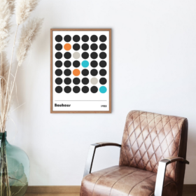 פוסטר באוהאוס וינטג' – 1923 גרפיקה מינימליסטית מקורית משנת 1923, המשלבת את עקרונות עיצוב הבאוהאוס בקומפוזיציה גיאומטרית נקייה. הפוסטר מציג מערך של עיגולים בשחור, המשולבים בנגיעות של כתום, טורקיז ואפור – צבעים האופייניים לתקופת הבאוהאוס.