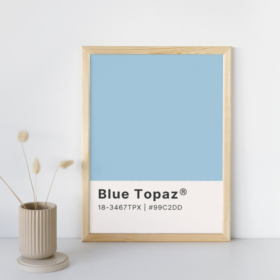 פוסטר מינימליסטי בהשראת כרטיסיות צבע, המציג את גוון Blue Topaz בעיצוב מודרני ונקי. השילוב של משטח הצבע התכלת העדין עם הטיפוגרפיה המדויקת והקודים הטכניים יוצר יצירת אמנות שהיא גם כלי עבודה השראתי למעצבים.